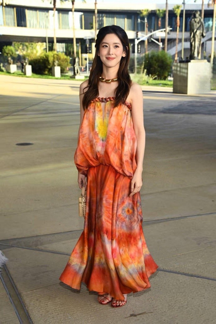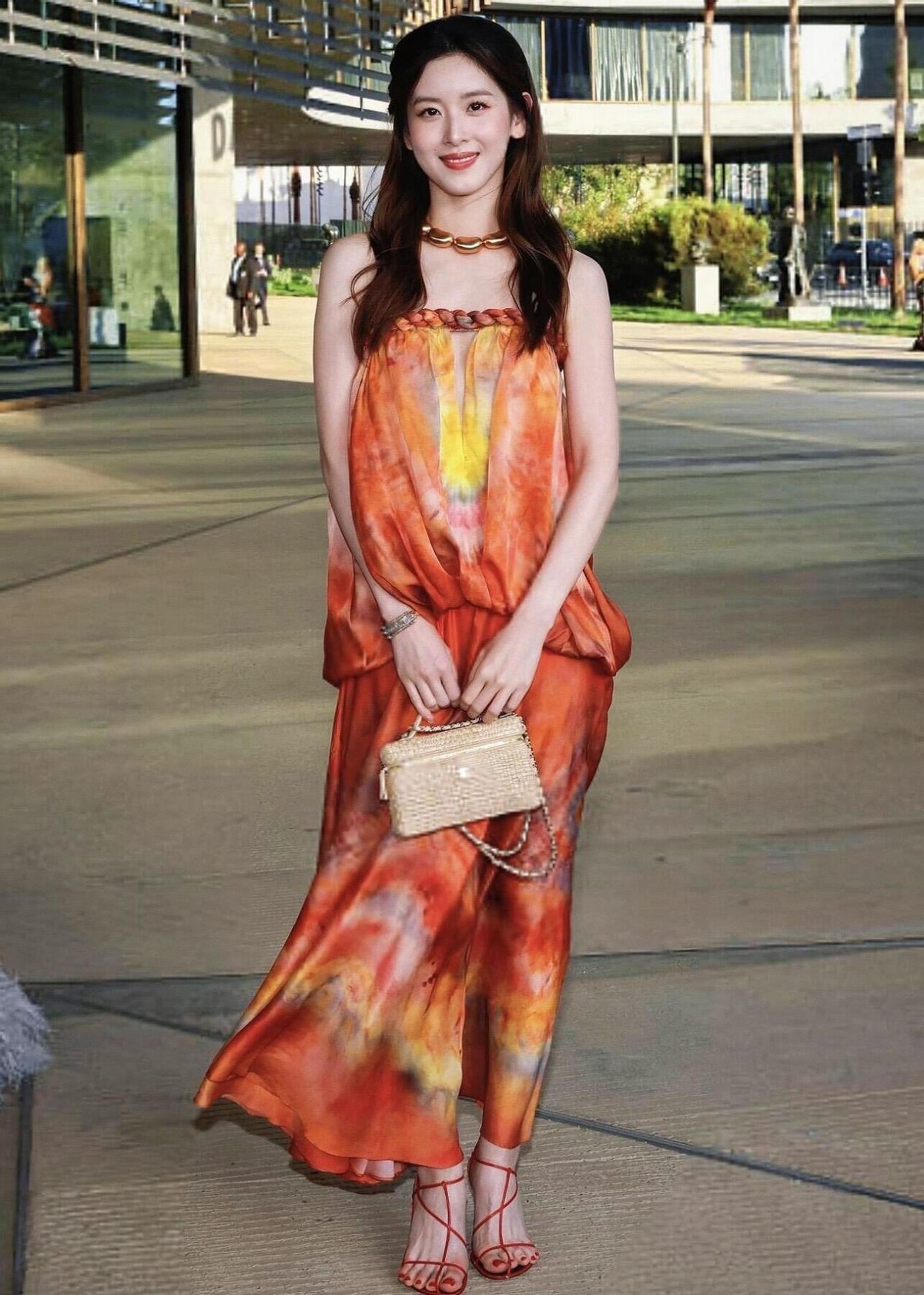 这一身抹胸连衣裙的搭配,让章泽天直接美成了 “人间落日”,一件橘黄渐变的扎染吊带长裙,像把整片晚霞穿在了身上,上半身是抹胸的设计,编织绳的领口带着度假风的随性,搭配垂坠感的缎面裙摆,走路时自带柔光滤镜,完全没有刻意的精致感,却处处透着松弛贵气。