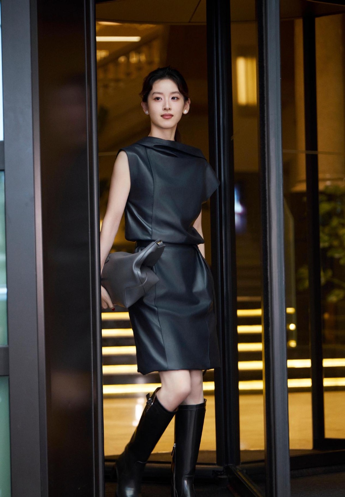 再看下面的套造型,直接颠覆了大家对她的印象,一身全黑皮质套装又酷又飒,妥妥的豪门掌权人既视感。无袖的皮质上衣设计感十足,不对称的翻领剪裁利落又干练,搭配同色系高腰半身裙,勾勒出利落的腰线,再配上一双高筒皮靴,整个人气场全开,又美又飒。