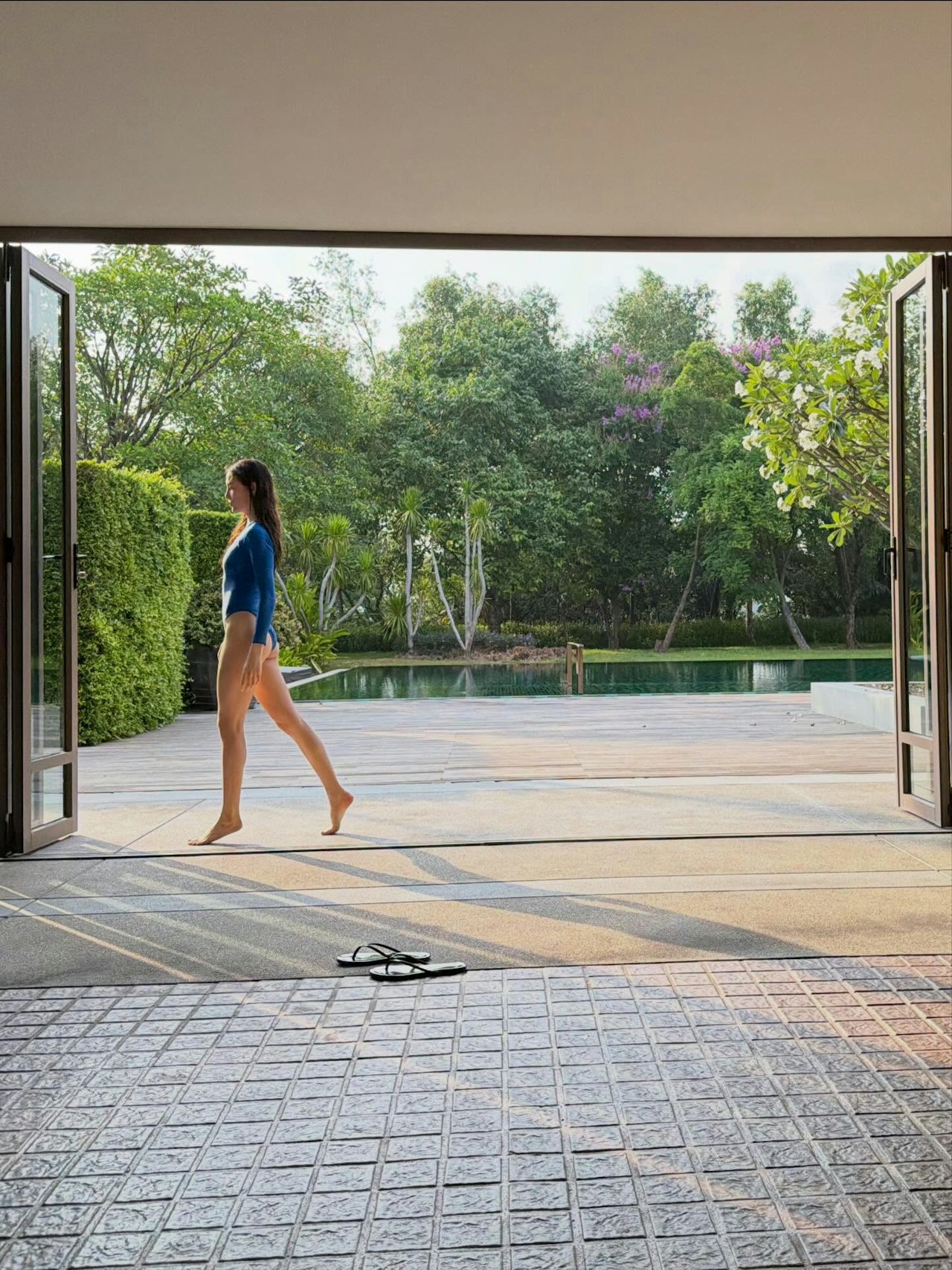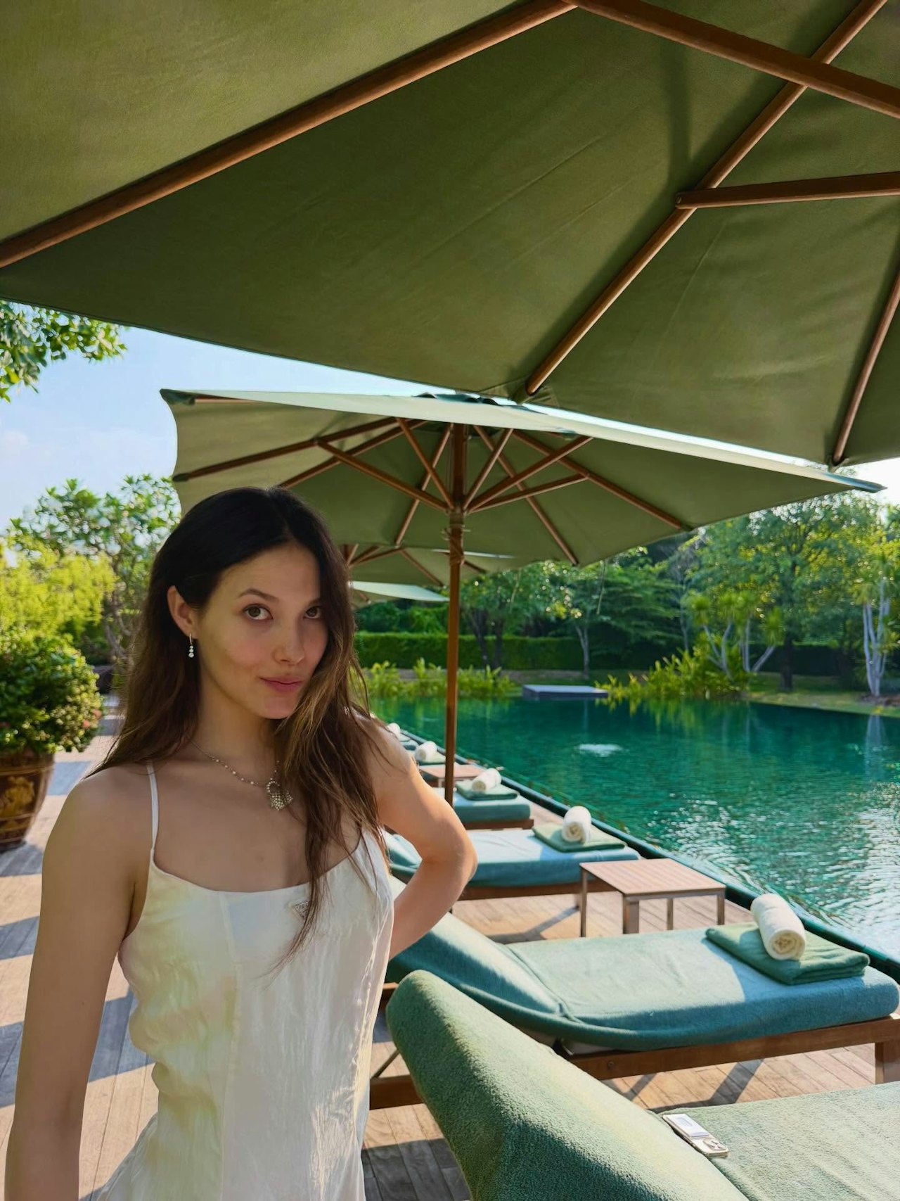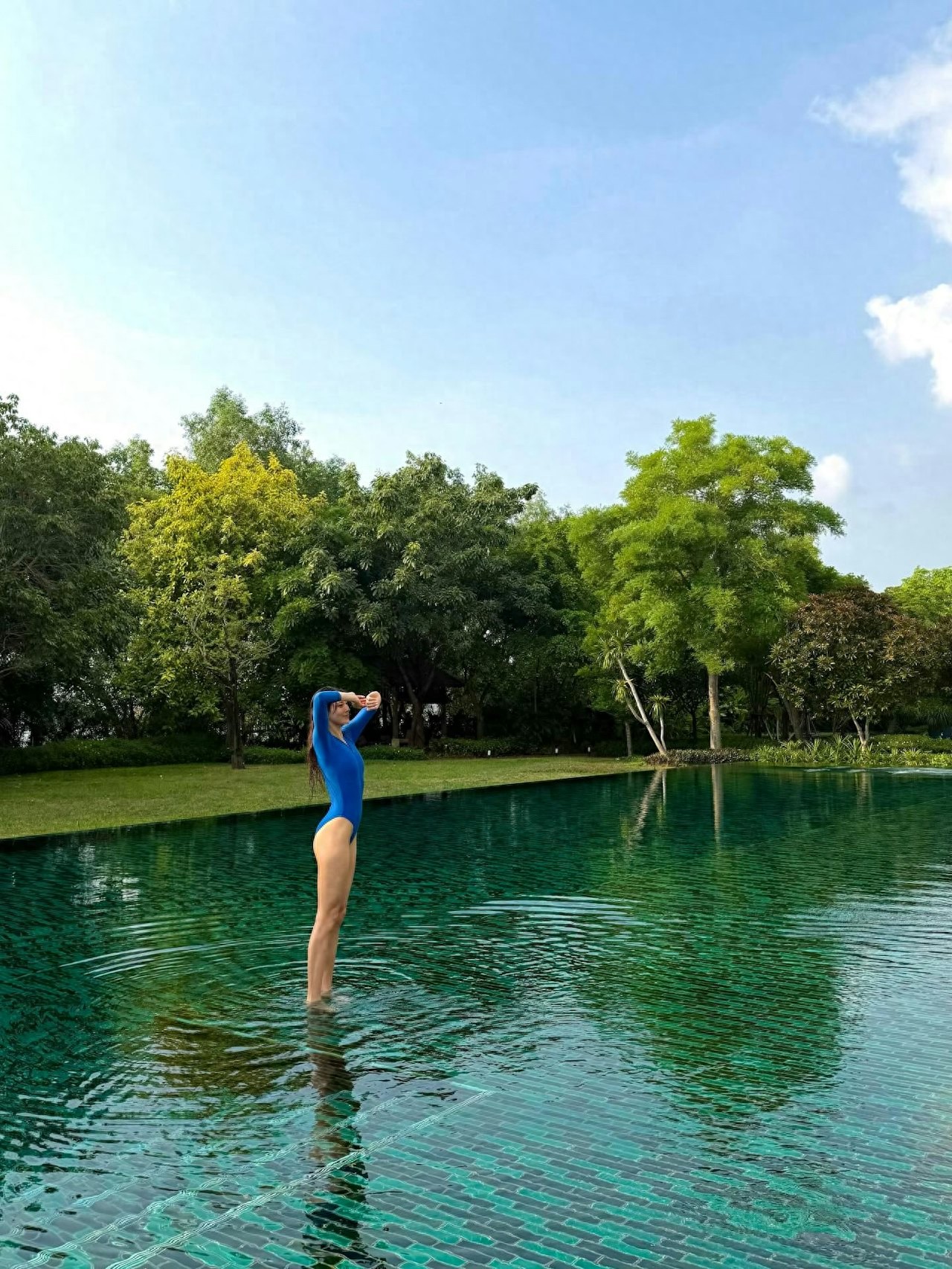 谷爱凌与何超欣在东南亚的国家旅游,她没有透露目的地,看起来像是在泰国,不管是哪里,总之就是个有山有水,有海滩的地方。姐妹俩没有去人多的地方,而是在度假区内活动。而去东南亚国家旅游,少不了的就是日光浴以及,水上运动,谷爱凌晒出了多张照片,大秀身材——到底是运动员,而且又年轻,从照片可见,谷爱凌的身材匀称,其中有一张是穿着蓝色一件头的泳装,在泳池里的照片,谷爱凌应该是才游完上岸,头发都是湿的,她伸展着身躯,身材高挑,长腿抢镜。