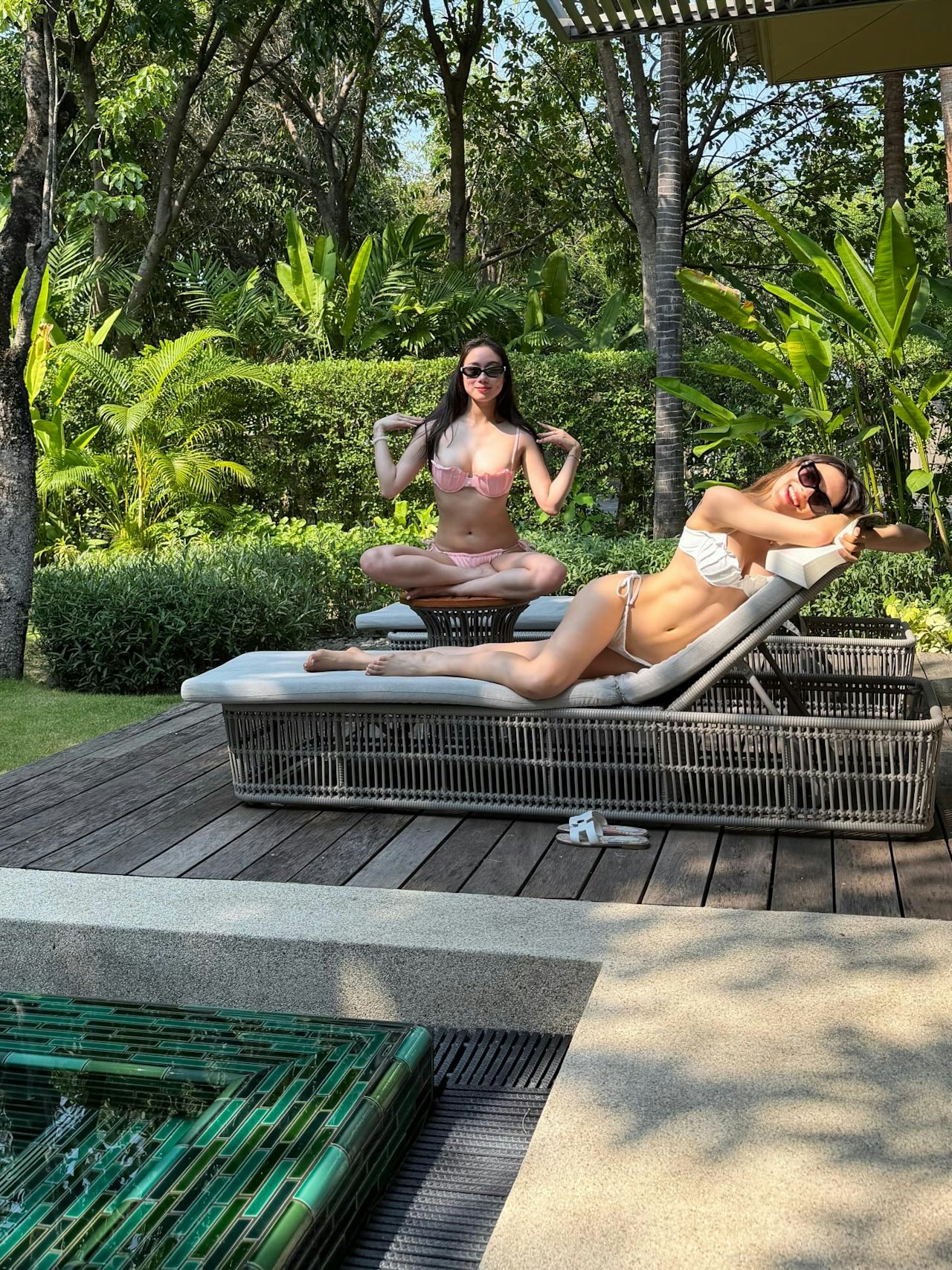 除了游泳,水上运动,也不少不了的是日光浴,何超欣也出镜了。从谷爱凌晒出的照片可见,她与何超欣打扮清凉,在泳池边的躺椅上惬意地享受放松时光。谷爱凌还不忘拿着一本书在阅读,而何超欣躺在一边放空自我。此外还有一张是两人正面镜头的照片,只见何超欣盘腿坐在椅子上,谷爱凌拿着书趴躺在长椅上,尽显妩媚。两人都不吝啬地展露出了好身材,对着镜头自然微笑,展露出健康之美。
