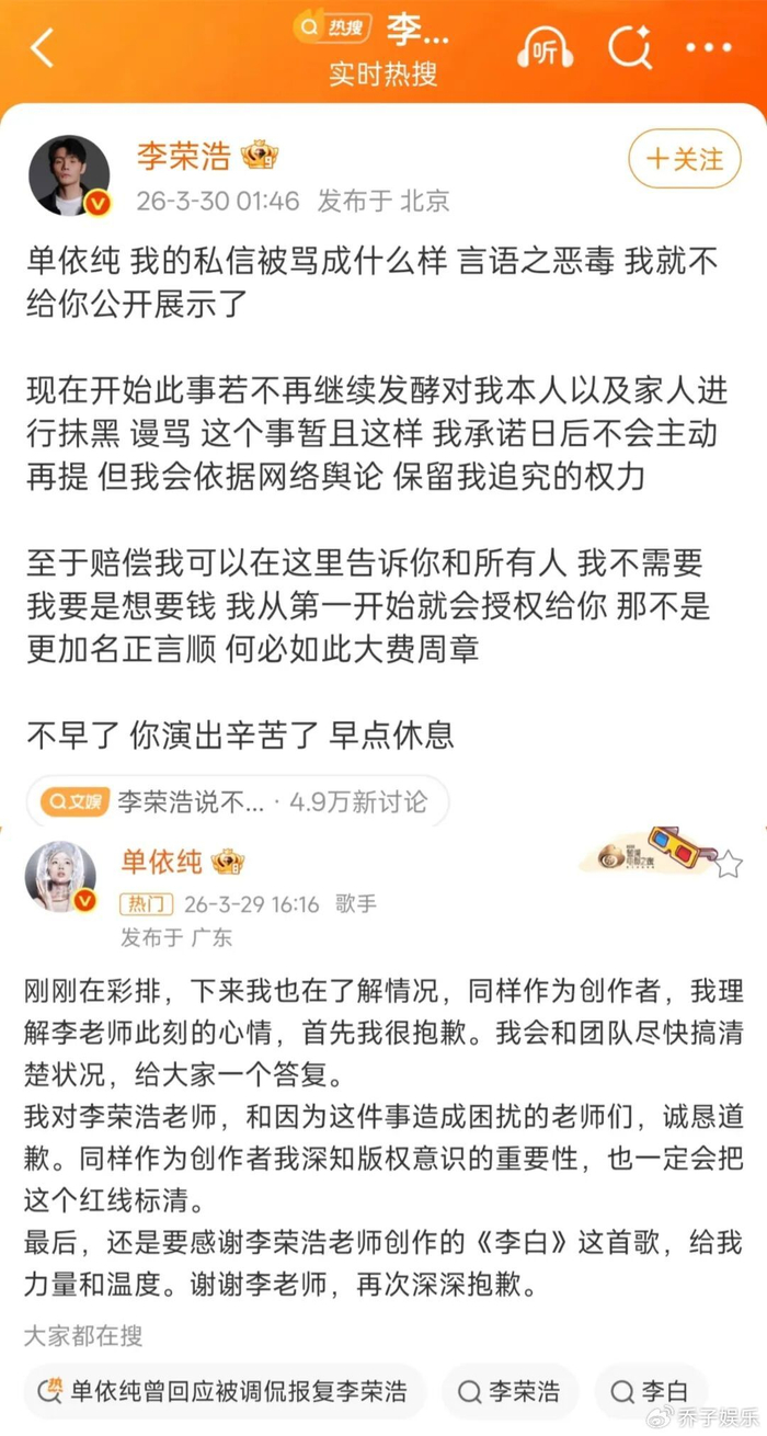 反观单依纯被锤了还狡辩,试图以敷衍的道歉来应付,不曾想被李荣浩继续重锤,箭头直指侵权,双方你来我往在微博上“打”了几回合,最终以单依纯一而再再而三的道歉收场。