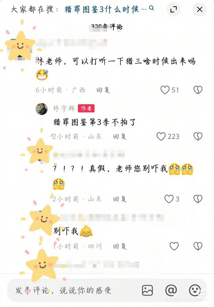林宇辉回网友评论时候说:檀健次的《猎罪图鉴3》不拍了。这部戏继续拍下去应该可以称得上他的养老剧,但有人爆料说:柠萌要檀健次确定演了才开始写本子,而檀健次方要求看全本才行,双方僵持不下。 但是内娱能看全本的艺人很少,孙俪这种大咖都不一定能看全部剧本,但有网友分析说是因为之前舆情的问题,导致大厂不敢冒险。 怎么看?