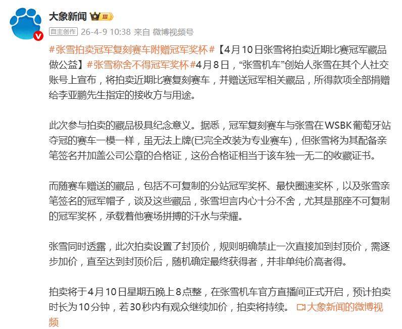 这场拍卖定在4月10日晚上8点,在张雪机车官方直播间进行,规则有点特别:设置了封顶价,并且禁止一次直接加到顶,必须逐步加价,达到封顶价后随机确定最终获得者,不是单纯价高者得,预计拍卖时长为10分钟。