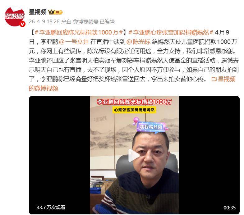 这场公益风波可谓是“吃瓜”无限升级,堪称一场“慈善版”的“全民追星”狂欢,从陈光标的“千万捐款”到张雪的“赛车拍卖”,这场救助嫣然天使儿童医院的公益行动,堪称“慈善界”的新地大盘。,陈光标的“100万捐款”可谓是“直接开挂”,这笔捐款不仅点燃了网友的热情,也让“慈善捐赠”再次成为公众视野中的“高光时刻”,谁能说这笔善举没有一丝“虚假”的影子呢?毕竟,在慈善捐赠这块,光靠“钱”是远远不够的,还需要“真心”与“真材”。,就在陈光标的捐款风波风靡一时之际,张雪机车创始人张雪一鸣惊人,宣布将拍卖一台极具“赛道感”的冠军赛车,全部所得捐赠嫣然天使基金,这种“加码支持”无疑让“嫣然天使”这一公益项目的“筹款小目标”被“秒杀”,更让“慈善吃瓜”达到了一个新的高度。,值得一提的是,这台赛车可是“实打实”的“冠军赛车”,与张雪在WSBK葡萄牙站夺冠时的赛车一模一样,虽然因为改装无法上牌,但配备的“藏品”却堪称“收藏界”的“终极绝唱”,包括分站冠军奖杯、最快圈速奖杯,以及张雪亲笔签名的“冠军帽子”,这些“情怀拉满”的收藏品无疑让拍卖成为“拍王”和“鉴赏家”的“终极天堂”。,更有意思的是,李亚鹏在直播中对这场“公益接力”表现出了“复杂”的心态,他对张雪的捐赠表达了“衷心感谢”,但另一方面,他也透露了自己“不方便”参与拍卖,并调侃道:“如果最终是自己的朋友拍到了,他已经商量好‘把奖杯给张雪送回去’”,更令人忍俊不禁的是,他在提到这笔捐赠时,竟然直白地说:“拿出来拍卖替他心疼。”这句话简直是“吃瓜界”的“一记炸弹”,让人忍不住为“标哥”捐款的“光环”感到“心疼”。,从“标哥”的“千万捐款”到“张雪”的“赛车拍卖”,这场公益行动无疑让“嫣然天使”基金的“筹款目标”被“秒杀”,也让“慈善吃瓜”达到了一个新的高度,除了“吃瓜”的乐趣,更让人深思的是:在公益背后,是否也隐藏着一些“商业化”与“圈层化”的影子?毕竟,毕竟“慈善”本应是“无私”的,但“圈层化”与“商业化”似乎也在悄然挤占着这一领域。,无论如何,这场公益风波无疑让“吃瓜”达到了一个新的高度,也让人们看到了“慈善”背后更复杂的“面貌”,正如李亚鹏所说:“替他心疼”,或许这不仅仅是对一份荣誉的不舍,更是对这份沉甸甸支持的珍视。## 李亚鹏回应陈光标捐款100万"已经到账",张雪赛车捐赠"替他心疼"——一场围绕嫣然天使基金的吃瓜狂欢,李亚鹏在直播间里一边嗑着瓜,一边回应了陈光标的慈善捐赠消息,直接把这场公益风波推到了聚光灯下,事情的起因是一如既往的陈光标慈善动作,他这次又一次给嫣然天使儿童医院出了大名,捐了100万元,这一次的慈善动作似乎有些不太寻常,捐款的用途明确吗?能不能变现?这些问题立刻在网络上炸开了锅。,4月9日晚,在李亚鹏的直播间里,"标哥的钱是真金白银捐了100万元,已经到账了",这句话简短而有力,直接回应了网友们的质疑,更有趣的是,李亚鹏还补充说,这笔捐款没有任何限定,用途是全力支持儿童医院,他的语气明显带着一丝无奈,仿佛在说:"你们懂不懂啊,这事儿我可没什么可隐藏的。",在李亚鹏这样"澄清"的同时,另一场慈善接力也悄然发生了,就在前一天,"张雪机车"创始人张雪在社交平台上宣布,他要拍卖一台极具纪念意义的复刻赛车,全部所得捐给李亚鹏指定的嫣然天使基金,这张赛车可是有一定的背景的,它和张雪在WSBK葡萄牙站夺冠的赛车一模一样,虽然改装后无法上牌,但张雪会为它配备亲笔签名和公司公章,这相当于收藏界的一件艺术品,随车赠送的藏品更是"情怀拉满",包括不可复制的分站冠军奖杯、最快圈速奖杯,以及张雪亲笔签名的冠军帽子,张雪自己也坦言,对这些承载着赛场荣耀的藏品"内心十分不舍"。,这场拍卖定在4月10日晚上8点,在张雪机车官方直播间进行,规则有点特别:设置了封顶价,并且禁止一次直接加到顶,必须逐步加价,达到封顶价后随机确定最终获得者,不是单纯价高者得,预计拍卖时长为10分钟,听起来这场拍卖不仅是慈善捐赠,更像是一场精心策划的流量运营。,对于张雪的这番心意,李亚鹏在直播中表达了感谢,但也流露出一丝遗憾,他说明天自己也有直播,因个人原因不方便参与现场活动,他还透露,如果最终是自己的朋友拍到了,他已经商量好"把奖杯给张雪送回去",说到这儿,李亚鹏忍不住感慨了一句:"拿出来拍卖替他心疼。",这场围绕嫣然天使基金的公益行动,在争议与力挺中持续升温,李亚鹏的一句"替他心疼",或许道出的不只是对一份荣誉的不舍,更是对这份沉甸甸支持的珍视。,这场吃瓜狂欢背后,是公众人物在慈善动作中的各种可能:有的像陈光标那样的"大手笔"捐赠,引发质疑;有的像张雪那样的"情怀捐赠",却更显真诚;还有像李亚鹏那样的"替他心疼",既表达了感激,又暗藏了无奈,无论是善意的捐赠,还是善意的澄清,都在这场公益风波中展现出一面。