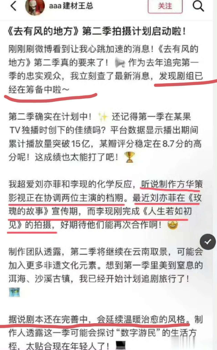 不过,也有一些网友觉得有些后知后觉,他们忍不住问:这部剧真的那么好看吗?怎么就开始筹拍第二季了?的确,对于这种温馨治愈类的剧集,难免会有一部分观众不能完全领略其中的美好。在如今这个浮躁的时代,很多观众更喜欢那些剧情起伏、节奏快、甚至越爽越好的剧集。而《去有风的地方》则像一股温泉,涓涓细流,温润且深远。它不是那种一眼就能看完的剧,而是需要用心去品味,静下来时,它会给你不一样的感动。 李现,作为剧中的男主角,去年还特意返回拍摄地,重温当初拍摄时的点滴。他站在那个曾因剧集而变得热闹非凡的地方,看着逐渐增多的游客,心中满是感慨,他由衷地说道:真好!那一刻,或许也是他对于这段旅程最深切的情感流露。