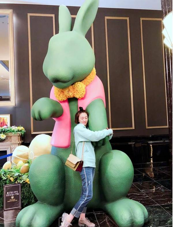 李小冉拥抱兔子雕像