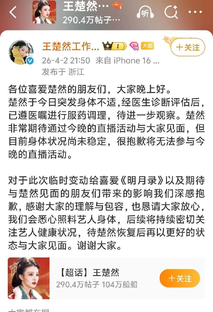 官方也同步回应,对王楚然的缺席表示歉意,同时告知大家无需担心,团队会全力照顾其身体,后续情况将随时同步。