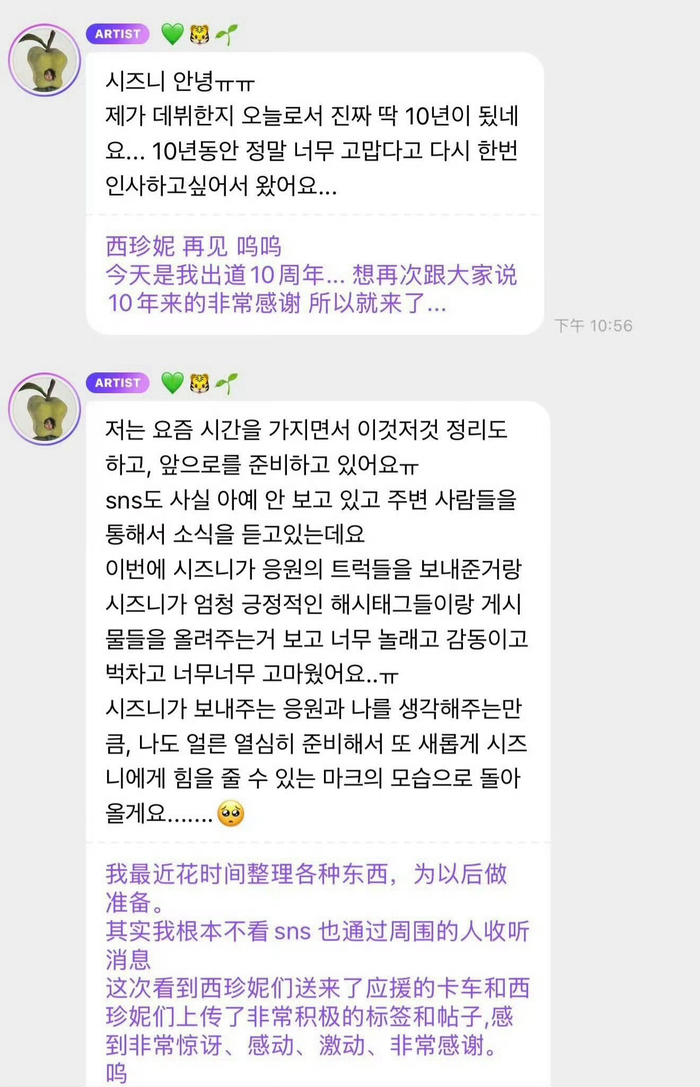 “还有最重要的是真的真的很感谢你们,我下次还会再来的再一次真心祝贺NCT十周年..”