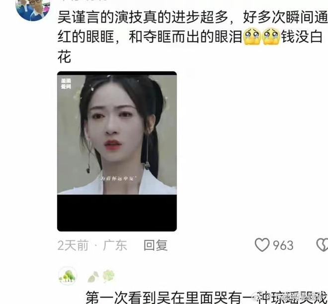 吴谨言的演技确实有了极大的提升,好几次瞬间眼红,泪水夺眶而出,这太有进步啦!