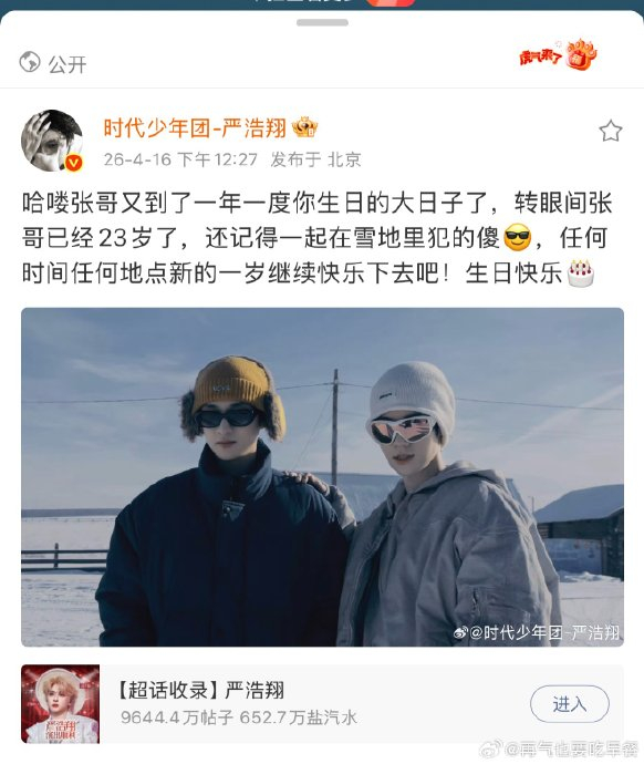 2026年生日,严浩翔在微博晒出二人雪地打滚的旧照,配文"还记得一起在雪地里犯的傻"。借"任何时间任何地点继续快乐"的宣言,将年少荒唐升华为终身约定。这种用童年意象续写成年誓言的叙事,成为竹马情深的视觉图腾。