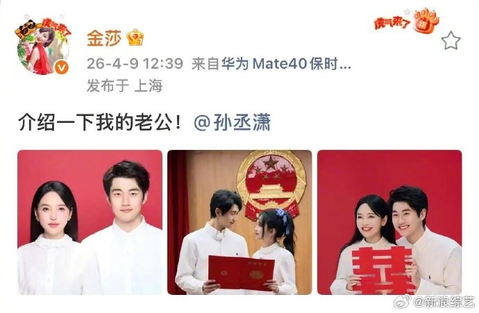 2026年4月9日,45岁的歌手金莎与小19岁的男友孙丞潇同步晒出结婚登记照,以"介绍一下我的老公/老婆"甜蜜官宣领证,为这段曾饱受争议的姐弟恋画上圆满句号。