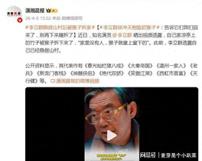 据悉,李立群此前已透露自己隐居山村生活。作为观众熟悉的老戏骨,他的代表作包括《春光灿烂猪八戒》《大秦帝国》《温州一家人》《老兵》《新龙门客栈》《神雕侠侣》《绝代双骄》《笑傲江湖》《西虹市首富》《天行健》等。如今,从荧幕上的帝王将相、江湖豪侠,到山野间与猴子“斗智斗勇”的普通住户,李立群这种回归质朴、幽默应对生活琐事的状态,反而让观众看到了另一种生动。