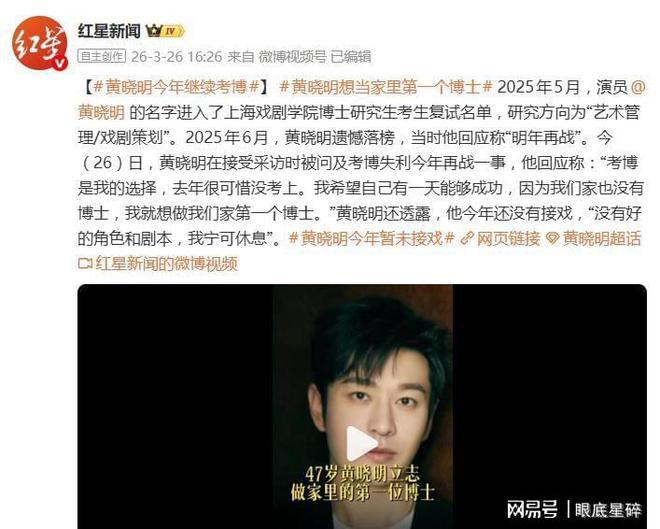 **黄晓明的“考博风波”:一场关于“光环”与“真实”的精神盛宴**,3月26日,黄晓明在香港的一次采访中,坦然回应了去年“明星考博”风波的结果,他坦言“很可惜没考上”,但语气平静,与“家里没有博士,想成为家里第一位博士”相辅相成,这番话,既道出了一个追求学术成就的朴素愿望,也在舆论场上划出了一道鲜明的“真实感”线。,时间倒退到2025年5月,黄晓明的名字出现在上海戏剧学院博士研究生复试名单上,研究方向是“艺术管理/戏剧策划”,这一消息在网络上引发热议,既有对他的支持,也有对他“明星特权”的质疑,然而到了6月,结果公布,他遗憾落榜,当时他没有选择回避,而是直言“明年再战”,这种“按规则出牌、坦然接受结果”的态度,在“明星特权”频繁被质疑的时代显得格外珍贵。,没有诉苦,没有找借口,黄晓明的表现恰恰展现了一种“普通人追梦”的积极信号,在这个人人都可以成为“成功人士”的时代,真正的努力与坚持往往被“光环”和“特权”所掩盖,黄晓明选择了用实际行动证明自己,他用47岁的年龄和普通考生的状态去竞争,这种“放下身段”的态度,堪称“真实感”的典范。,除了学业,黄晓明在事业上也展现出了极强的选择能力,他透露今年尚未接戏,理由是“没有好的角色和剧本,我宁可休息”,这与他选择考博的态度一脉相承,都是“不凑合,不将就”的态度,这种对职业道路的谨慎和对学术追求的专注,剥离了明星光环下的浮躁,展现出一种内在的成熟与自我认知。,从试图成为“家里第一个博士”的朴素愿望,到对剧本质量的严格要求,黄晓明的形象在舆论场上被重新定义,不是一个试图用光环换取捷径的明星,而是一个以实际行动诠释追求的普通人,他用自己的方式证明,真正的“人设”不在于光环与特权,而在于认准目标、按规矩努力、坦然面对得失。,在这个热衷造神也乐于看塌房的时代,黄晓明的“真实感”或许才是最难能可贵的“人设”,这种形象的转变,不仅让人感受到真实的努力与坚持,也为“普通人”的奋斗提供了一个值得学习的榜样。