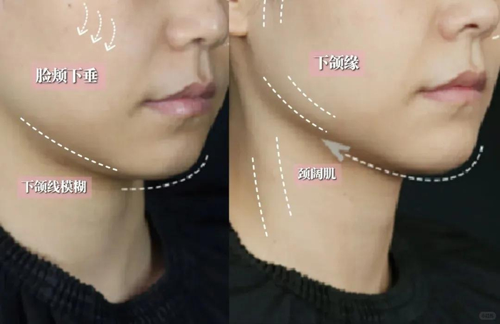 颈阔肌过度牵拉、下颌缘脂肪堆积+皮肤松弛,共同造成轮廓臃肿、下颌线消失。