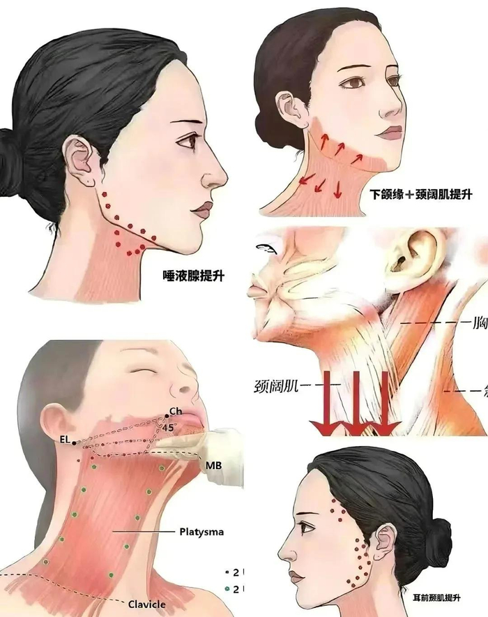 英伦大提升的重点在于放松颈阔肌,辅助放松降口角肌以优化轮廓。