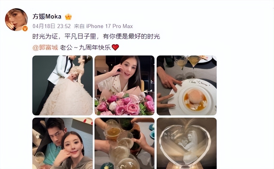 4月18日那天,郭富城准时在社交平台上晒出了和方媛的合照,单手比了个"9"的手势,配了句"长长久久"。方媛也很快发了条动态回应,还附上了丈夫送的纪念礼物照片。按理说,夫妻俩你来我往互表心意,挺正常的一件事。