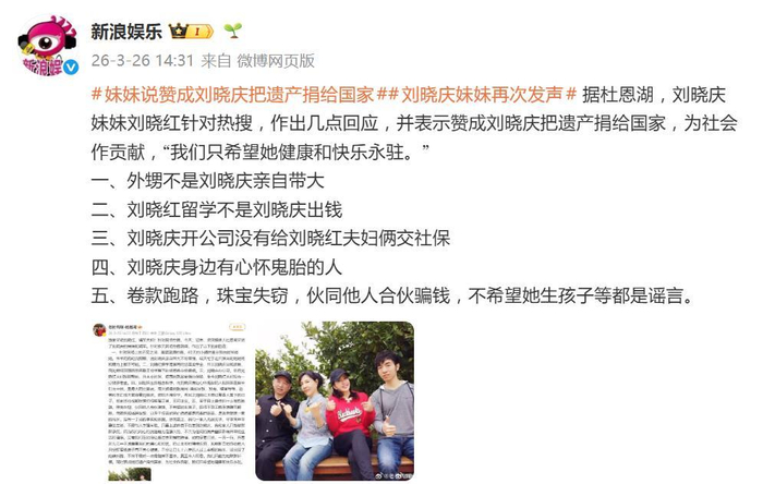 妹妹刘晓红在声明末尾,赞成姐姐将遗产捐给国家的决定,并表示“为社会作贡献”。这一表态,与早年家族内部“独占财产”的期待形成了尖锐而讽刺的对比。它仿佛在宣告:当亲情被金钱的期待所绑架并最终破裂后,最彻底的解决方式,或许是让财富彻底脱离家庭的范畴。