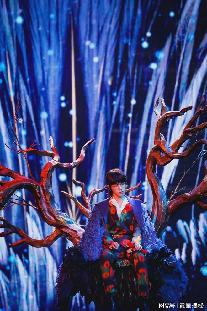 华晨宇所坐的宝座的造型是无花的扶桑树,而花身上穿的图案是扶桑花花朵,坐在那里就是花花变成了扶桑花在扶桑树上绽放的样子,然后披风很像金乌的羽翼,金乌栖息在开花的扶桑树上,他是花亦是“太阳”