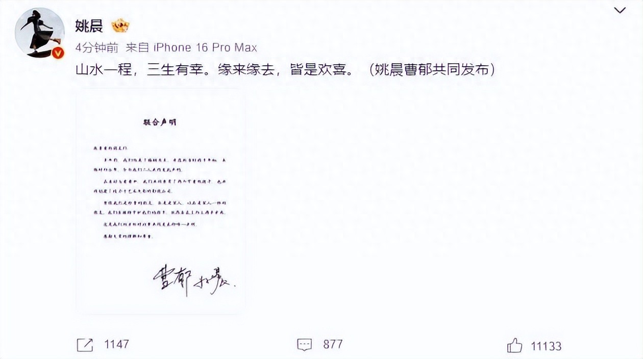 2026年3月16日,姚晨和曹郁在才刚一起发了“离婚”声明。