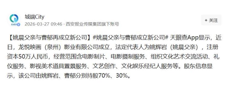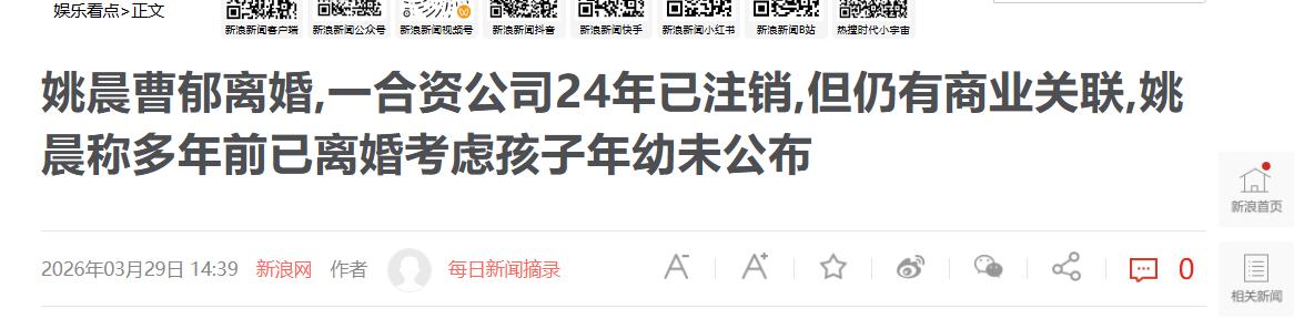 新浪网2026-03-29姚晨曹郁离婚,一合资公司24年已注销,但仍有商业关联,姚晨称多年前已离婚考虑孩子年幼未公布