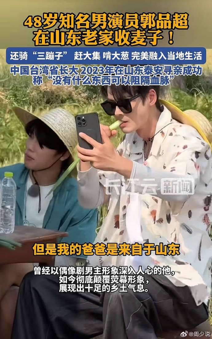 从偶像剧男神到山东大汉,郭品超的转变显得既自然又真实。这位1977年出生在台湾的演员,凭借2004年在《斗鱼》中的表现而一举成名,之后又出演了《将夜》《三生三世枕上书》等一系列热门剧集,凭实力牢牢占据了演员的位置。然而,他却从未被明星光环所束缚。相反,他似乎更加享受这种回归田园的平凡生活。网友们戏谑道:看他骑三轮摩托的样子,比演偶像剧还要自然。更有人笑言:这哪像48岁,明明就像28岁的小伙子,回到家乡后,整个人的状态简直太好,年轻得不像话! 其实,娱乐圈中不少明星都喜欢回到家乡,体验那份朴实无华的生活,但像郭品超这样彻底融入其中的却并不多见。他在社交平台上,毫不保留地分享自己在田间地头、集市上的日常。没有精心修饰的滤镜,只有最真实的烟火气息。这种贴近生活的作风吸引了无数粉丝,大家纷纷表示:这样的明星才最真实,完全没有距离感。或许,正是对生活的真挚热爱和对家乡的深切眷恋,让他在48岁依然保持着如此旺盛的活力,活出了许多人心中的理想状态。 如今的郭品超,既在忙碌的工作中拍戏,又能享受家乡的平凡生活。即便偶尔被网友遇到,他总是笑着与人打招呼,丝毫没有一丝明星的架子。有人问他为何如此热衷于回到家乡,他答道:这里有我的根,这里有家人的味道,感觉特别踏实。或许,这正是最理想的生活方式——在荧幕上发光发热,在生活中却能够安然回归本真。这样的郭品超,难道不正是我们心中向往的样子吗?