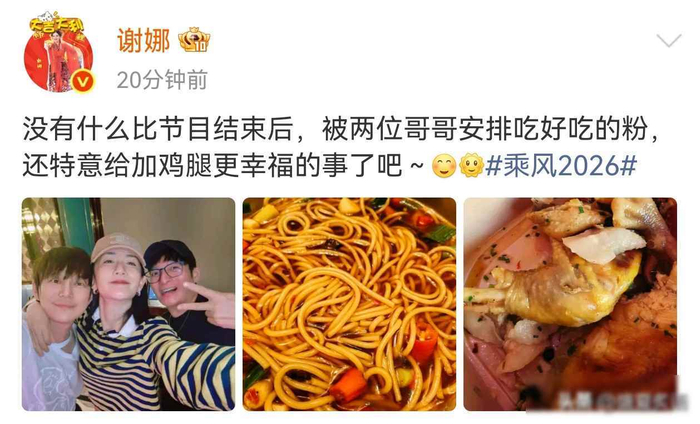 4月6号晚上快到12点,谢娜连着发了好几张照片,照片里她和何炅、李维嘉一起坐在街边小摊前面,桌上摆着几碗湖南米粉,粉上还搁着大鸡腿,热气直往上冒,谢娜把胳膊搭在何炅肩膀上,头靠着他,笑得很自然,不像平时节目里那种表演出来的开心样子,李维嘉举着剪刀手,脸有点红,就像学生时代拍合照那样随意,谢娜配的文字只有一句,说节目结束最幸福的事就是被他们带着去嗦粉,虽然没提具体是哪档节目,但大家一看就明白是《乘风2026》刚录完。
