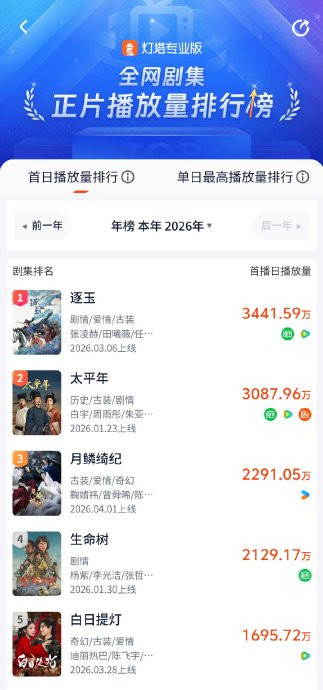 灯塔数据显示首日播放量超2500万,创2026年独播剧单日TOP1;