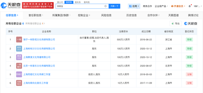 天眼查任职信息显示,李荣浩名下关联6家企业,其中4家处于存续状态,包括海宁一样影视文化传媒有限公司、上海树枝沙沙文化传媒有限公司、上海穆漾文化传播有限公司、北京一样音乐文化传播有限公司,李荣浩在上述企业担任法定代表人、执行董事等职务。