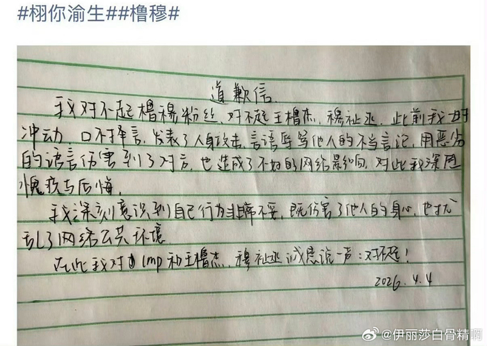 栩你渝生粉丝写给橹穆的道歉信