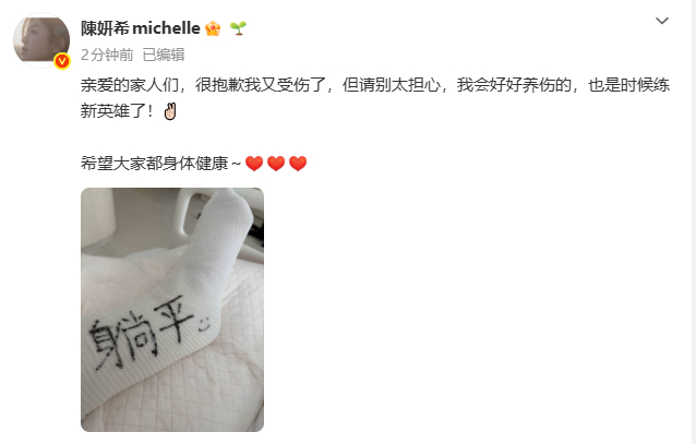 大家好!首先,衷心感谢大家一直以来对妍希的关注与支持。今日,我们怀着抱歉的心情,向大家告知妍希在运动中意外受伤情况。
