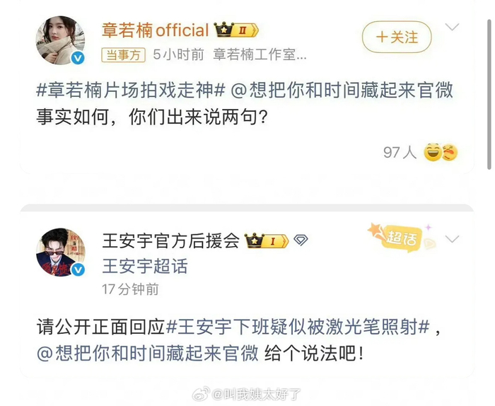 《想把你和时间藏起来》剧组还怪惨的,不是被工作室喊话就是被粉丝后援会喊话。