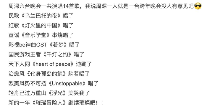 周深已经是这几年跨年晚会的常客了,今年尤其“离谱”,他一个人参与了6台跨年晚会的录制,唱了14首歌,没有一首是重复的。