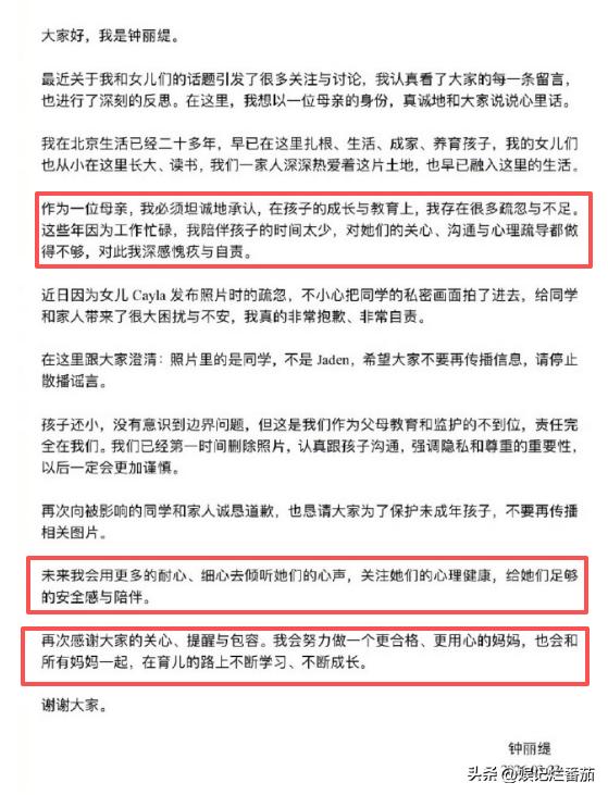 但是,钟丽缇将过错全部揽到了自己身上,说是自己在教育孩子时,存在很多的疏忽和不足。