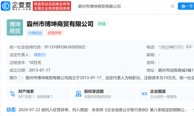 查询企查查发现,张静初名下共关联4家公司,仅霸州市博坤商贸有限公司、北京博量文艺创作工作室为存续状态,其余两家个人独资工作室已注销。值得注意的是,2024年7月,霸州市博坤商贸有限公司因未按规定公示年度报告被河北省廊坊市霸州市市场监督管理局列入异常经营名录。