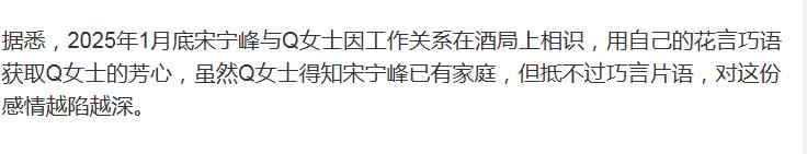 爆料称,宋宁峰婚内就和Q女士走到了一起,Q女士一开始就知道宋宁峰有家庭、有孩子,但架不住宋宁峰的甜言蜜语,还是选择“知三当三”。