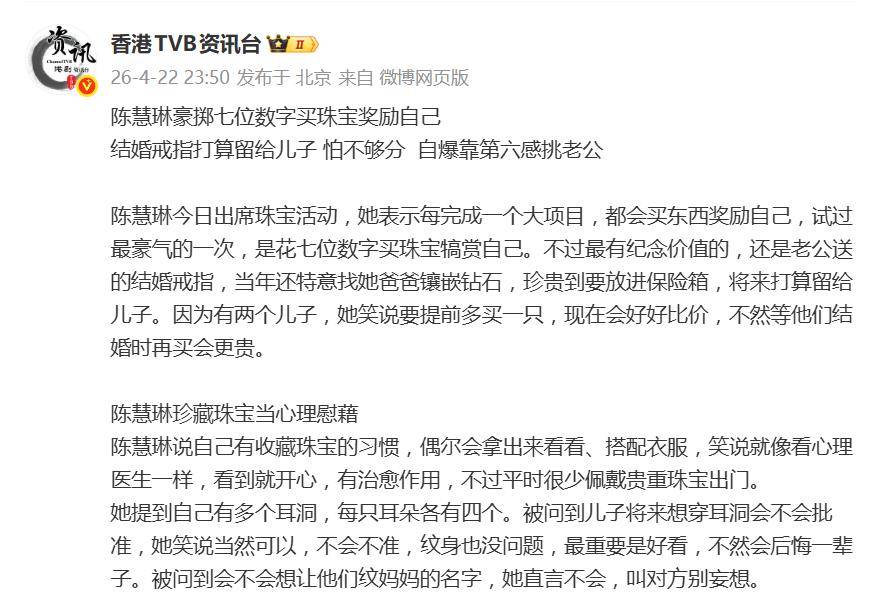 据网友4月22日晚间爆料,陈慧琳在出席珠宝活动时的一番“硬核”分享,瞬间让这位天后的形象在“女神”与“接地气师奶”之间无缝切换,引发网友热议。