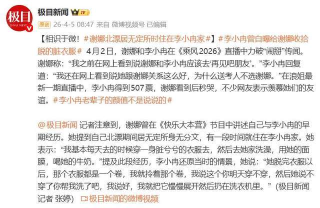 《乘风2026》最新直播中,谢娜看到李小冉获得507票的瞬间泪崩,这一幕将“谢娜李小冉神仙友谊”推上热搜。镜头之外,一段长达二十年的“收留史”被重新翻开,从北漂时李小冉为谢娜清洗卷成团的脏衣服,到如今谢娜敞开长沙家门邀对方同住,这场双向救赎终于等来了轮回。