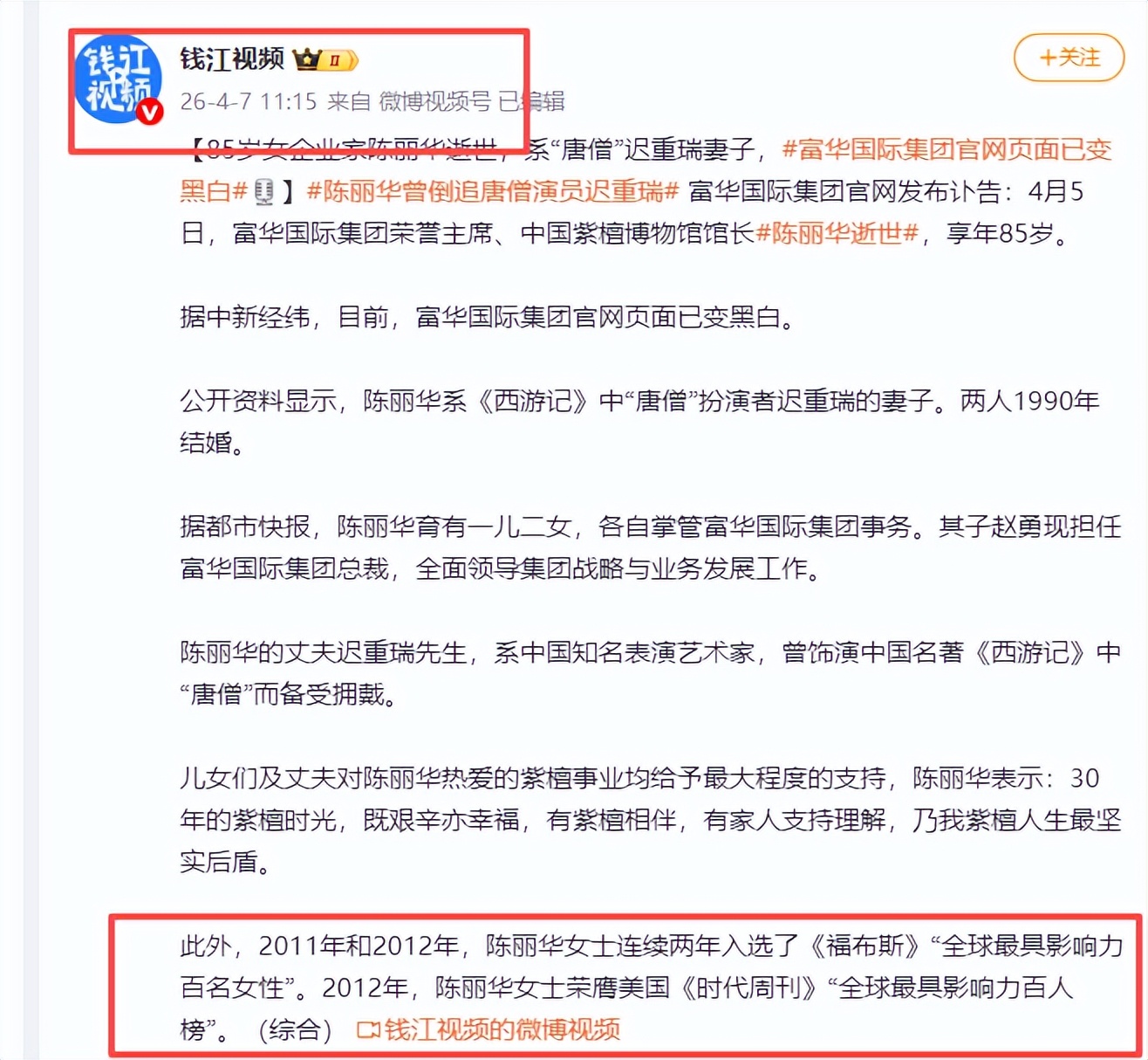 4月7日,富华国际集团发布讣告,正式公布了陈丽华离世的消息。