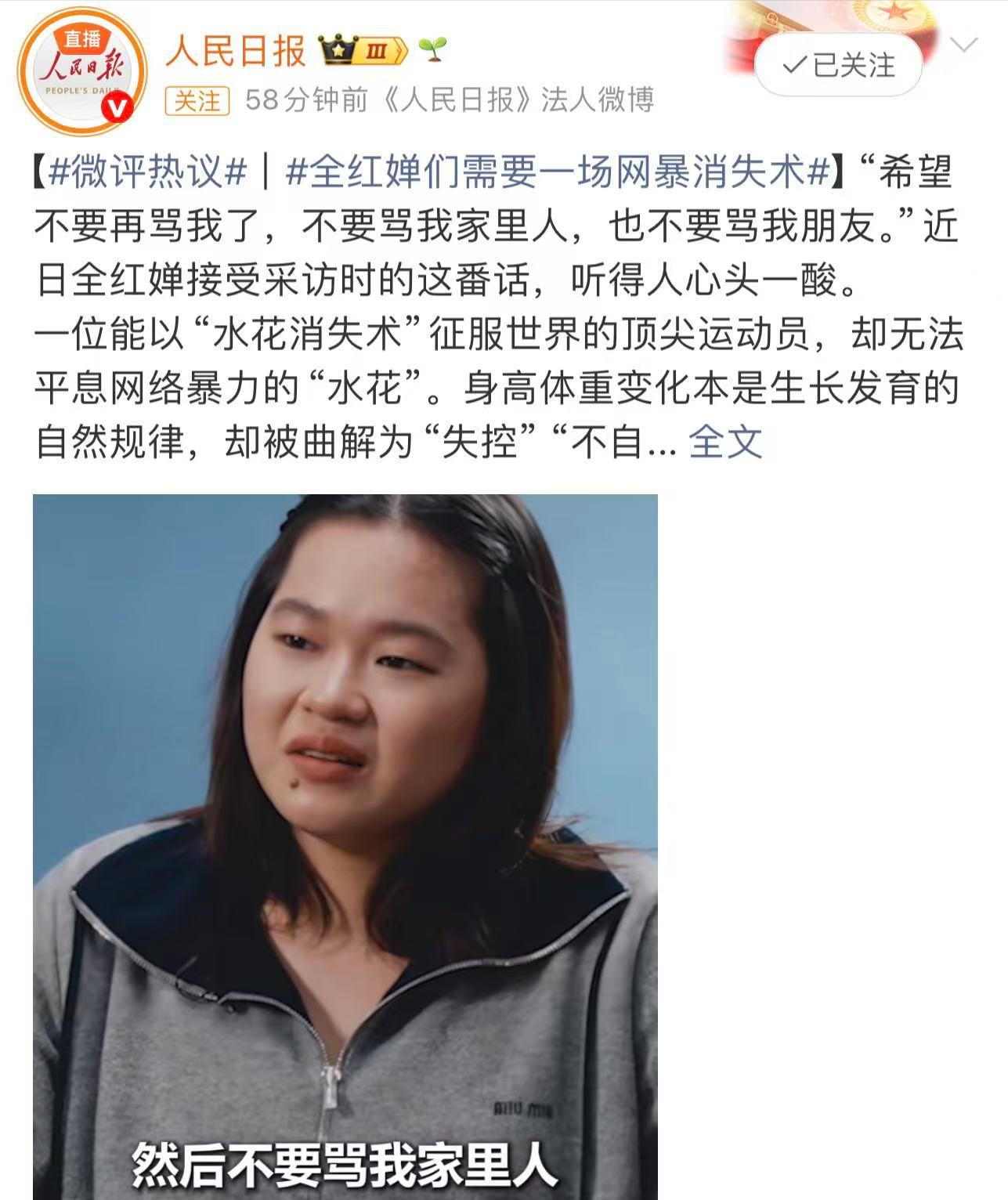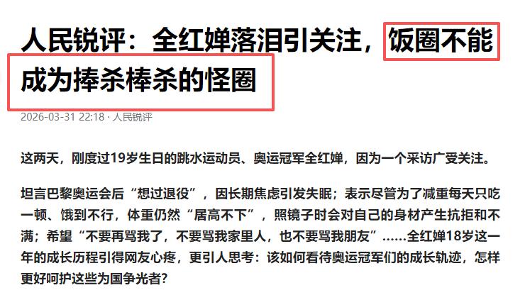 最近,全红婵的风波又上了热搜,这波“吃瓜”简直让人血压飙升!19岁的奥运冠军,居然在镜头前哭到崩溃,难怪人民日报一针见血地戳中了所有人的心声,13个字道出了饭圈文化的本质:“饭圈不能成为捧杀棒杀的怪圈”。,全红婵的故事,真的让人心酸啊!从农村走出来的她,凭借着天赋和努力,在东京奥运会上摘得金牌,瞬间成为全民偶像,鲜花和掌声围绕着她,可没人想到,这份光环背后,是被压缩的童年,她的世界只有跳台、水花和日复一日的训练,根本没有时间去玩耍,甚至连正常的成长都被训练给碾碎了。,转眼间,饭圈文化就像一只魔爪,扑面而来,粉丝们围在训练馆门前,直播间里全程蹲守,连她的日常起居都被搬上网络,那些所谓的“应援”,本应是支持,结果变成了她喘不过气的负担,更让人揪心的是,长期的网暴不仅伤害了她,还延迟了她的青春期,直到17岁,她才迎来人生第一次例假!这背后,是为跳水付出的隐性代价。,身体的变化让她的招牌动作207C变得陌生,训练中的失误变得常态,为了稳住状态,她只能拼命控重,每天只吃一顿饭,水都要掐着量喝,长期的极端节食,让她出现代谢紊乱,精神状态越来越差,更令人心痛的是,她的脚踝和胫骨布满旧伤,参赛时发烧未愈,脚踝疼得站不稳,还是咬着牙完成了所有动作,最终遗憾摘银。,网暴的魔爪不仅伸向了她,还伸向了她的家人和朋友,老家被不明人士围拍,家人的生活被严重打扰;她的私信被恶意轰炸,朋友也被牵连拉踩,连正常交往都变得小心翼翼,体育圈的饭圈乱象早已不止于此,乒乓球赛场上,嘘对手、爆粗口的现象层出不穷,甚至有选手遭遇种族歧视式辱骂,官媒也曾多次狠批这种乱象,却始终没能根治。,2026年3月底,全红婵在采访中情绪失控,刚满19岁的她,压抑已久的情绪彻底爆发,反复哀求着希望那些谩骂能停止,她的坦言让人心痛:巴黎奥运会结束后,她认真想过退役,19岁,本该是对未来充满憧憬的年纪,却在压力和谩骂中,考虑放弃自己热爱了十几年的跳水事业。,这些年轻的运动员,既要应对身体的变化、训练的压力,还要承受来自网络的恶意,体育总局的出手,人民日报的定调,都是为了还给运动员一片干净的赛场,还给体育一份纯粹,希望全红婵能卸下压力,好好调整自己,也希望所有运动员都能被温柔对待,让体育回归拼搏本身,远离流量的喧嚣。,饭圈文化终究还是席卷了体育圈,让纯粹的赛场变了味,那些所谓的“粉丝应援”,那些铺天盖地的话题,慢慢变成了运动员的负担,国家体育总局动真格,2026年为体育饭圈深化治理年,整治名单直指核心:网络拉踩、恶意网暴、泄露运动员隐私、赛场互撕,这些困扰体育圈已久的乱象,被逐一点名,不留死角。,全红婵的风波,从来都不是小题大做,它戳穿了青少年体育人的艰难,也暴露了体育饭圈的乱象有多可怕,这些年轻的运动员,既要应对身体的变化、训练的压力,还要承受来自网络的恶意,体育总局的出手,人民日报的定调,都是为了还给运动员一片干净的赛场,还给体育一份纯粹。,希望全红婵能卸下压力,好好调整自己,也希望所有运动员都能被温柔对待,让体育回归拼搏本身,远离流量的喧嚣,这些年轻的运动员,既要应对身体的变化、训练的压力,还要承受来自网络的恶意,体育总局的出手,人民日报的定调,都是为了还给运动员一片干净的赛场,还给体育一份纯粹。,饭圈文化终究还是席卷了体育圈,让纯粹的赛场变了味,那些所谓的“粉丝应援”,那些铺天盖地的话题,慢慢变成了运动员的负担,国家体育总局动真格,2026年为体育饭圈深化治理年,整治名单直指核心:网络拉踩、恶意网暴、泄露运动员隐私、赛场互撕,这些困扰体育圈已久的乱象,被逐一点名,不留死角。,全红婵的风波,从来都不是小题大做,它戳穿了青少年体育人的艰难,也暴露了体育饭圈的乱象有多可怕,这些年轻的运动员,既要应对身体的变化、训练的压力,还要承受来自网络的恶意,体育总局的出手,人民日报的定调,都是为了还给运动员一片干净的赛场,还给体育一份纯粹。,希望全红婵能卸下压力,好好调整自己,也希望所有运动员都能被温柔对待,让体育回归拼搏本身,远离流量的喧嚣,这些年轻的运动员,既要应对身体的变化、训练的压力,还要承受来自网络的恶意,体育总局的出手,人民日报的定调,都是为了还给运动员一片干净的赛场,还给体育一份纯粹。,饭圈文化终究还是席卷了体育圈,让纯粹的赛场变了味,那些所谓的“粉丝应援”,那些铺天盖地的话题,慢慢变成了运动员的负担,国家体育总局动真格,2026年为体育饭圈深化治理年,整治名单直指核心:网络拉踩、恶意网暴、泄露运动员隐私、赛场互撕,这些困扰体育圈已久的乱象,被逐一点名,不留死角。,全红婵的风波,从来都不是小题大做,它戳穿了青少年体育人的艰难,也暴露了体育饭圈的乱象有多可怕,这些年轻的运动员,既要应对身体的变化、训练的压力,还要承受来自网络的恶意,体育总局的出手,人民日报的定调,都是为了还给运动员一片干净的赛场,还给体育一份纯粹。,希望全红婵能卸下压力,好好调整自己,也希望所有运动员都能被温柔对待,让体育回归拼搏本身,远离流量的喧嚣,这些年轻的运动员,既要应对身体的变化、训练的压力,还要承受来自网络的恶意,体育总局的出手,人民日报的定调,都是为了还给运动员一片干净的赛场,还给体育一份纯粹。,饭圈文化终