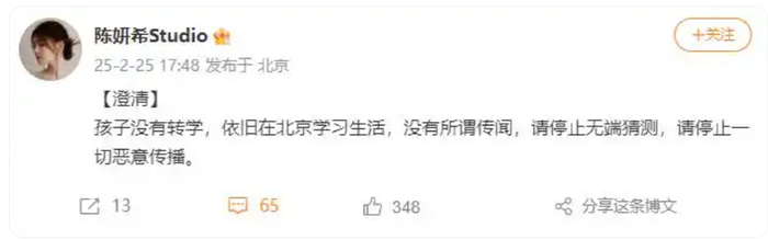 近日,网传陈妍希为儿子“小星星”办理转学手续并计划定居台湾的消息引发热议。对此,陈妍希工作室于25日发布声明明确表示:“孩子没有转学,依旧在北京学习生活,没有所谓传闻,请停止无端猜测,请停止一切恶意传播。”