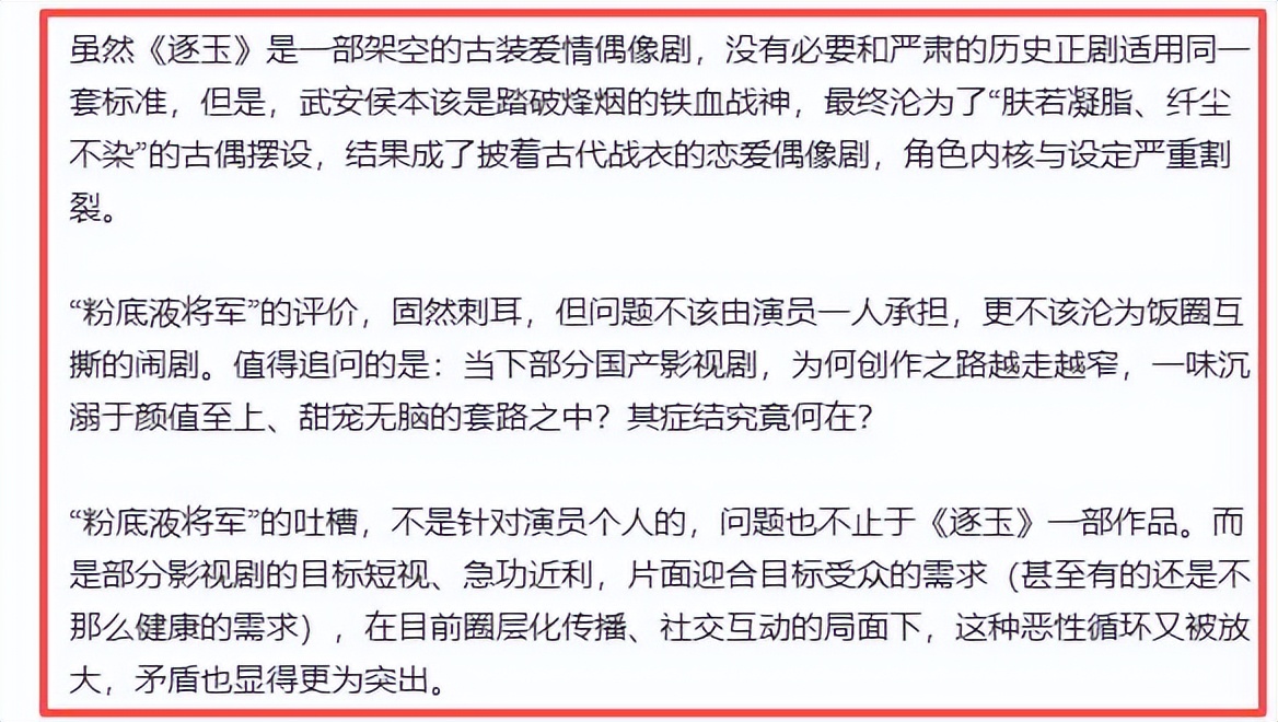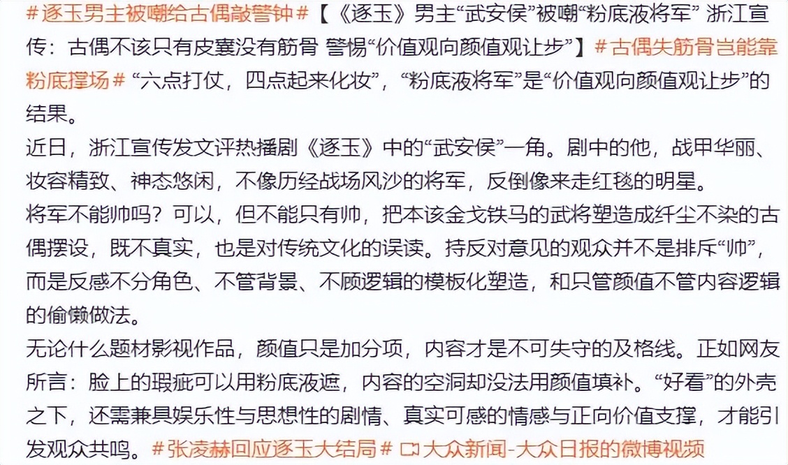 紧随其后,浙江宣传也发文,直言“古偶不该只有皮囊没有筋骨”,将《逐玉》的造型争议推向了高潮,也让张凌赫成了这场行业审美批判的焦点人物。