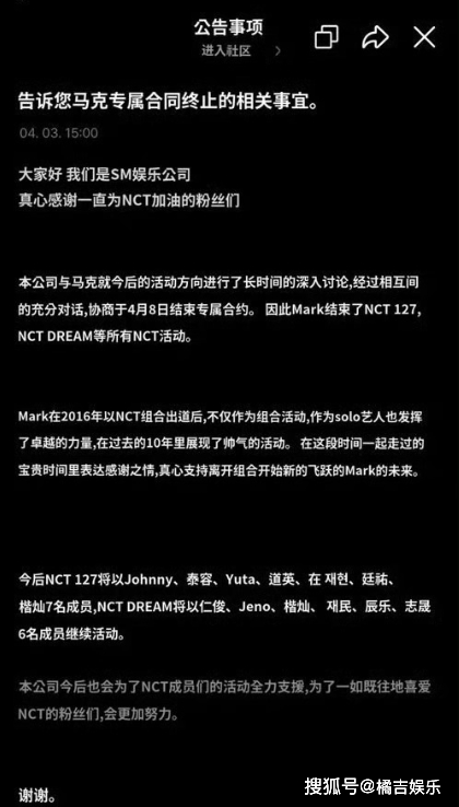 2026年4月3日,SM娱乐发布了一则令全球粉丝既感不舍又充满敬意的官方声明:NCT核心成员李马克(Mark Lee)因十年专属合约到期,决定不再续约,并将于4月8日正式结束在NCT 127及NCT DREAM的团体活动。这一消息瞬间引爆了网络舆论,但令人欣慰的是,整场告别没有撕扯与遗憾,只有对过往十年的深情致敬和对未来的无限憧憬。李马克用十载光阴,将青春最绚烂的篇章写在了舞台之上,他的选择并非是对过去的否定,而是基于对自我价值的深刻认知和对人生新阶段的勇敢规划。这种理性、成熟且充满尊严的告别方式,为所有正在追梦的年轻人树立了一个极佳的榜样,让我们明白,无论身处何种境地,保持初心、尊重选择、体面转身,才是通往幸福与自由的钥匙,也是偶像精神中最动人的光芒。