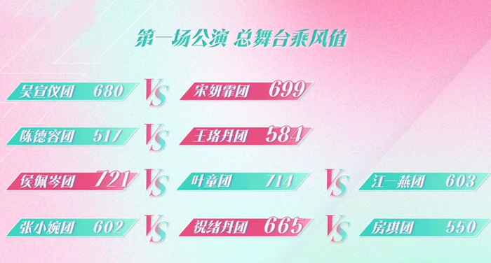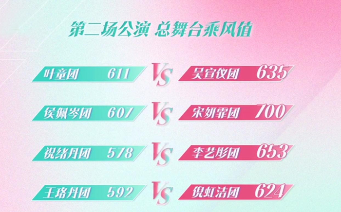 紧张激烈的对决之后,4个团获得胜利并全员晋级,其中宋妍霏团、李艺彤团排名前两名,全员晋级的同时也成为“乘风领衔团”。