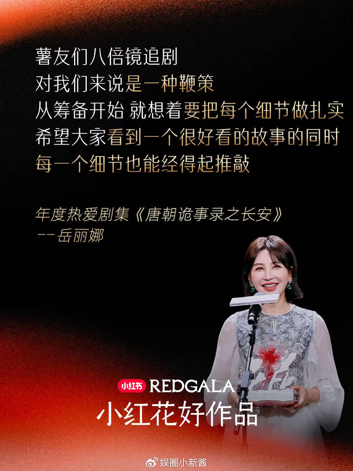 长安夜色未散,故事仍在生长,当口碑回归真诚,热爱自有千钧之力。此次荣获小红书REDGALA“年度热爱剧集”,印证了优质内容自带热爱力量。未来,岳丽娜将继续带领长信传媒坚守创作初心,深耕《唐诡》IP长线发展,以匠心打磨作品、以热爱传递文化,持续打造有质感、有风骨、有温度的影视佳作,不负每一份深情偏爱,让好的故事在热爱中持续绽放光彩。