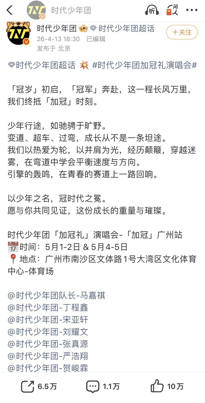 时代少年团发文表示:#时代少年团[超话]# 💥 #时代少年团加冠礼演唱会#「冠岁」初启,「冠军」奔赴,这一程长风万里,我们终抵「加冠」时刻。少年行途,如驰骋于旷野。变道、超车、过弯,成长从不是一条坦途。我们以热爱为轮,以并肩为光,经历颠簸,穿越迷雾,在弯道中学会平衡速度与方向。引擎的轰鸣,在青春的赛道上一路回响。以少年之名,冠时代之冕。愿与你共同见证,这份成长的重量与璀璨。