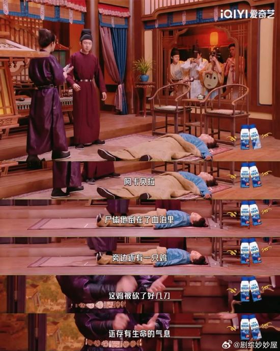 本期最大亮点无疑是蒋龙在sketch《唐朝小事录》中的表现。他饰演的探案官携“音乐团”而非“探案团”登场,将悬疑现场秒变歌舞秀。当尸体线索与阿卡贝拉合唱荒诞交织(“尸体倒血泊旁有只鸡,鸡被砍数刀仍有气息”),探案节奏彻底失控。鑫仔试图维持秩序却无力回天的反差感,让观众直呼“笑到缺氧”。蒋龙此前多以正剧形象示人,此次放飞自我的喜剧节奏把控,意外展露其鲜为人知的“梗王”潜质。