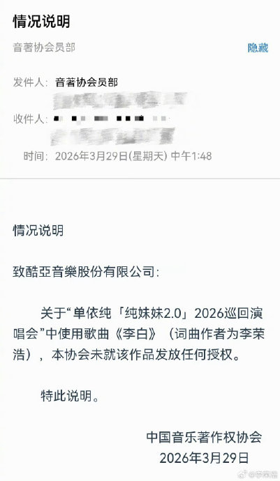 2026年3月28日,单依纯在“纯妹妹2.0”深圳巡回演唱会上翻唱李荣浩代表作《李白》。经中国音乐著作权协会(音著协)官方邮件确认,该演出未获任何授权许可。证据显示,单依纯团队曾在演出前申请授权,但遭李荣浩版权方明确拒绝。在明知被拒的情况下,单方仍坚持演唱,构成法律定义的“强行侵权”。