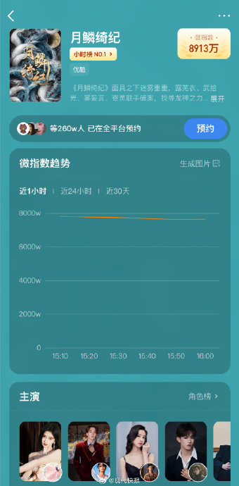 剧集自3月22日官宣后,优酷站内预约量迅速突破196万,3月31日因税务争议澄清及定档官宣,单日暴涨至300万,刷新平台年度古装剧预约纪录。开播前全网累计预约量超260万,微博剧集热度指数达8913万,豆瓣实时热度221万,均位列待播榜首位。