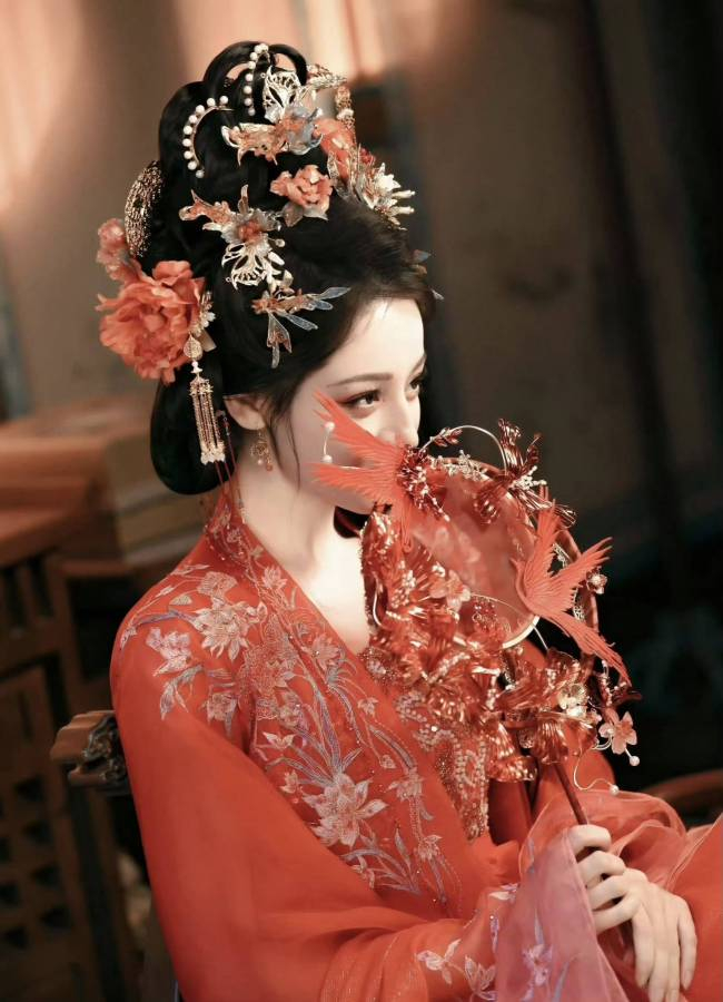 酒红长袍上缀满金色刺绣和琉璃珠,走动时珠玉轻响。头上繁复的发髻插满珍珠金簪,尽显古典风范。妆容方面,红黑撞色眼影配上颧骨鎏金高光,凸显了热巴立体的面部轮廓,明艳大气。剧中设定的白发紫瞳更添妩媚与冷感,完美诠释了“又妖又美”。