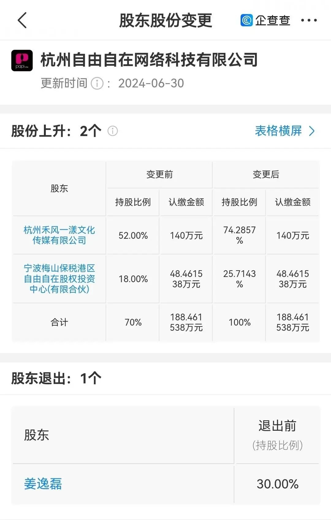 2024年6月底,papi酱退出杭州自由自在网络科技有限公司股东行列。